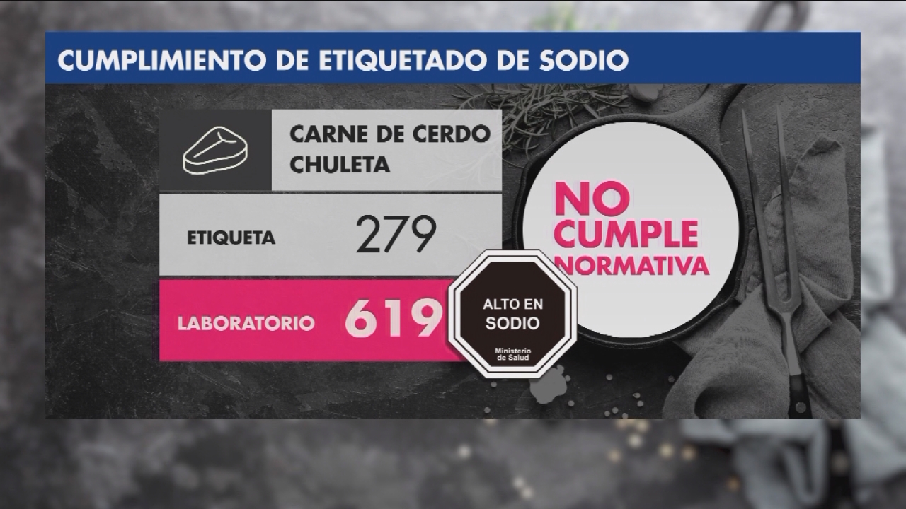 La investigación hizo hincapié además en el cumplimiento del etiquetado de sodio. Según la tabla nutricional rotulada de una chuleta, tenía 279 de sodio, en el laboratorio la cifra aumentó a 619. Lo que además supondría que el producto debería tener el sello negro por ser marinado. Según la conadecus tampoco cumple con la normativa.
