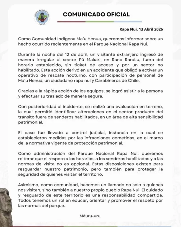 “Hacemos un llamado no solo a quienes nos visitan, sino también a nuestro propio pueblo Rapa Nui. El cuidado y resguardo de este territorio es una responsabilidad compartida. Todos tenemos un rol en educar, orientar y promover el respeto por las normas del parque“, expresaron.