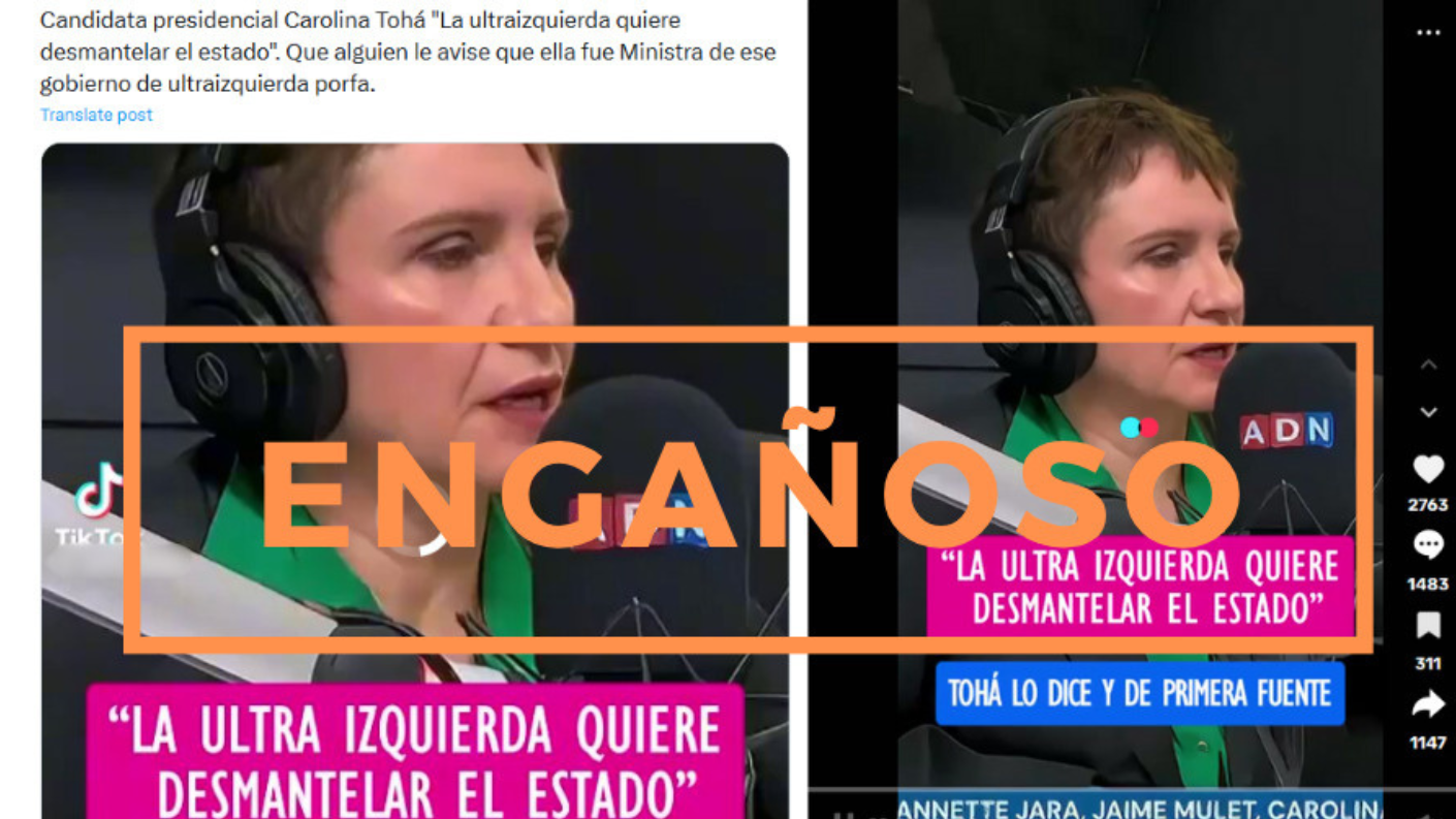 Por ende, calificamos como engañoso que la precandidata presidencial, Carolina Tohá, afirmó que la ultraizquierda quiere desmantelar el país. En realidad, la exministra del Interior sí mencionó la frase, pero se corrigió segundos después para referirse a la ultraderecha. Esta rectificación no aparece en el clip que se viralizó en redes, el cual se comparte sin este contexto.
