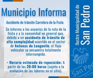 De acuerdo a lo informado por la por Municipalidad de San Pedro de Melipilla, se espera que a las 20:00 horas la carretera vuelva a estar operativa.