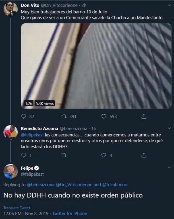 El orden público y el respeto a los DDHH son elementos fundamentales de la democracia. Cuando el Estado no es capaz de garantizar la paz social, y terminamos en la ley de la selva, también se vulneran los DDHH de las personas por parte del Estado. Esa debió ser mi respuesta.— Felipe (@felipekast) November 8, 2019