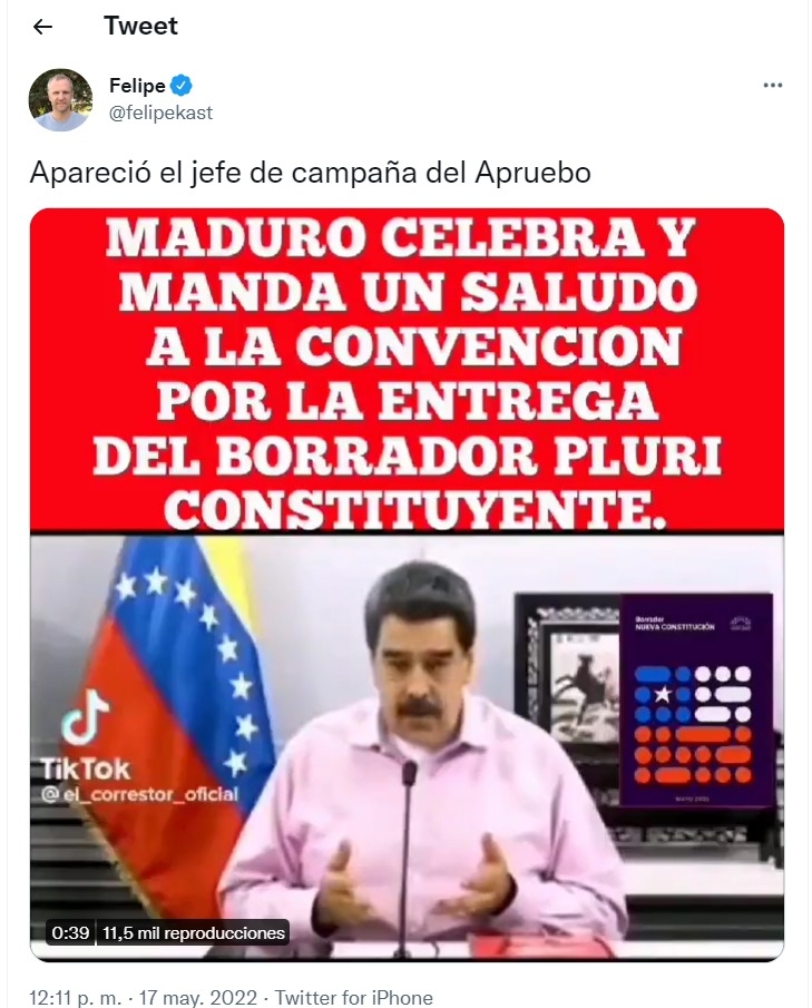 Duranta la jornada de este martes 17 de mayo, el senador de Evópoli, Felipe Kast, compartió en sus redes sociales un video en el cual se ve al líder parcialmente reconocido de Venezuela, Nicolás Maduro, enviando un supuesto apoyo a la Convención Constitucional tras la reciente entrega del borrador de la nueva carta fundamental.