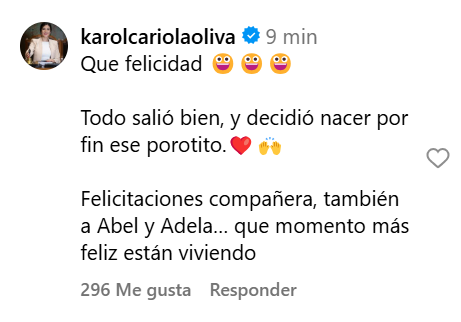 La publicación de Camila Vallejo de inmediato se comenzó a llenar de mensajes de felicitaciones, uno de esos fue escrito por Karol Cariola, presidente de la Cámara de Diputados, y quien pronto también se convertirá en madre.