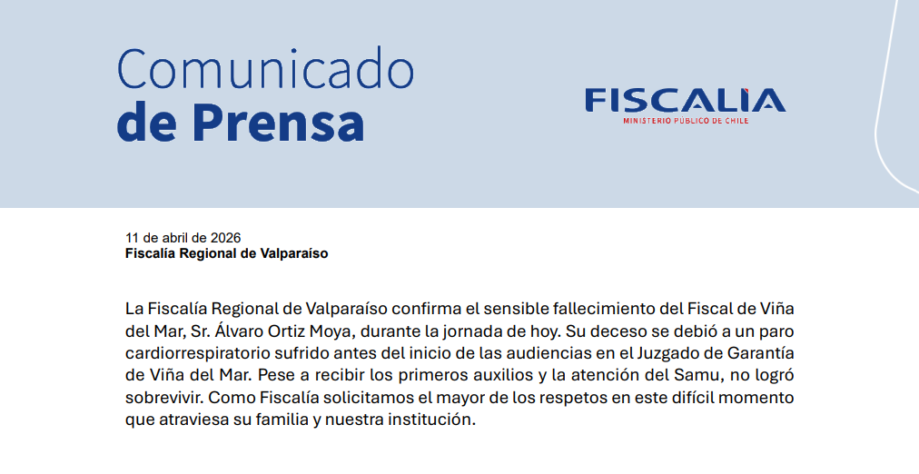 De acuerdo con el comunicado enviado por Fiscalía, la autoridad sufrió un paro cardiorrespiratorio antes de iniciar la audiencia de control de detención en el Juzgado de Garantía de Viña del Mar.
