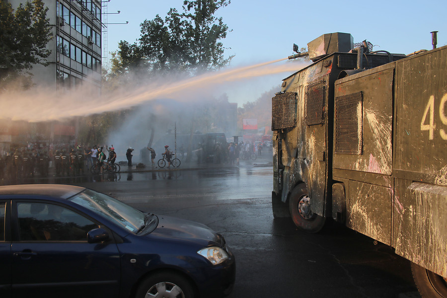 Carabineros reconoció coloración inusual en líquido usado por carro lanza agua durante las protestas ocurridas este viernes en Plaza Italia. Esto, luego de que manifestaste acusaran haber sido roseados con un líquido amarillo, el cual les habría provocado lesiones y heridas.