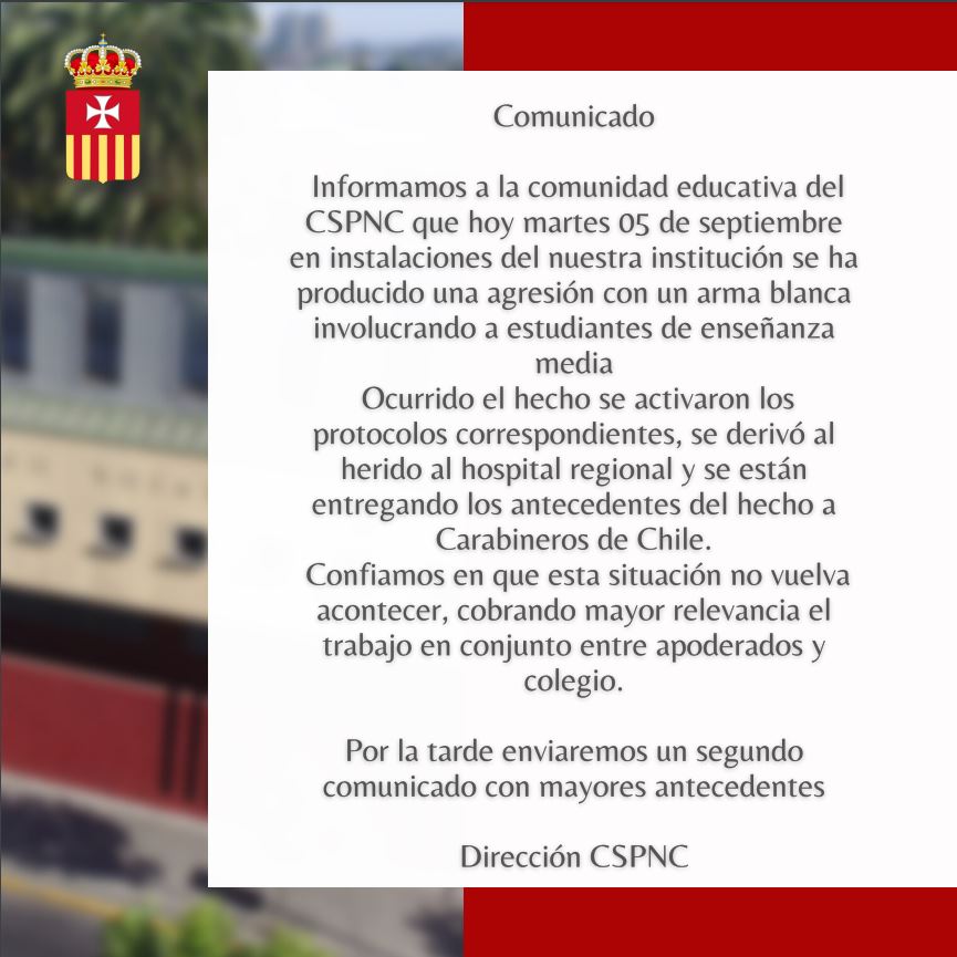 se ha producido una agresión con arma blanca involucrando a estudiantes de enseñanza media. Ocurrido el hecho se activaron los protocolos correspondientes".