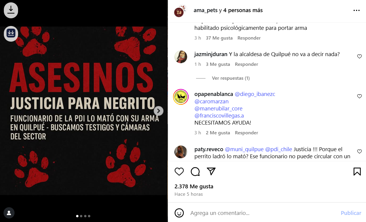 La testigo hizo hincapié en que el disparo se produjo a metros de distancia de ella, por lo que su vida también estuvo en peligro. Al respecto, los cuidadores de Negrito están buscando testigos o cámaras del sector y señalaron en Instagram: "Porque Negrito no murió en vano. Porque su memoria merece justicia".