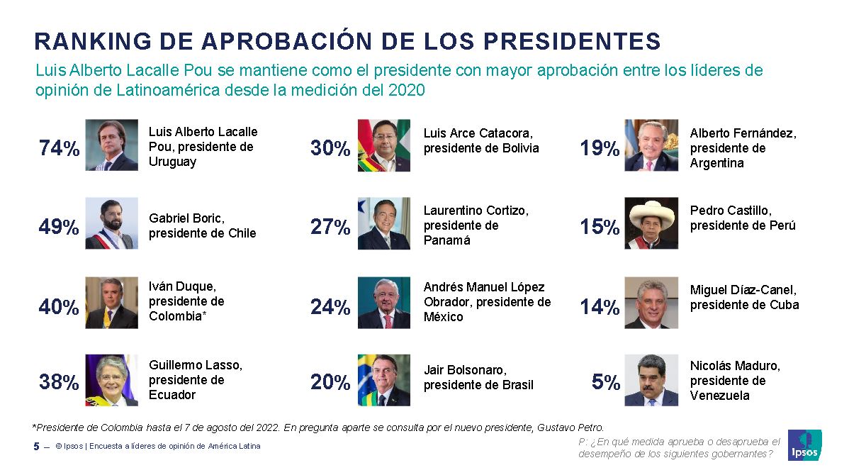 En el otro extremo, el presidente peor evaluado es Nicolás Maduro, de Venezuela, con solo un 5% de aprobación.