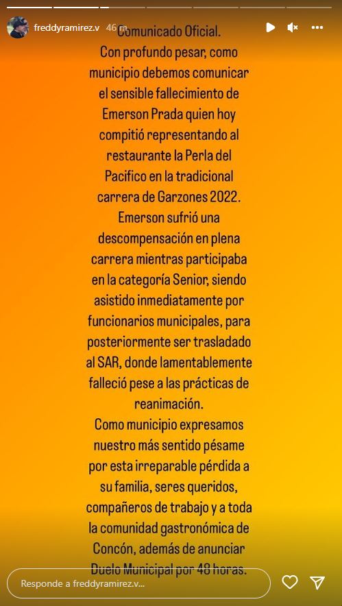 "Como municipio expresamos nuestro más sentido pésame a esta irreparable pérdida, para su familia, seres queridos, compañeros de trabajo y a toda la comunidad gastronómica de Concón", añadió Ramírez.