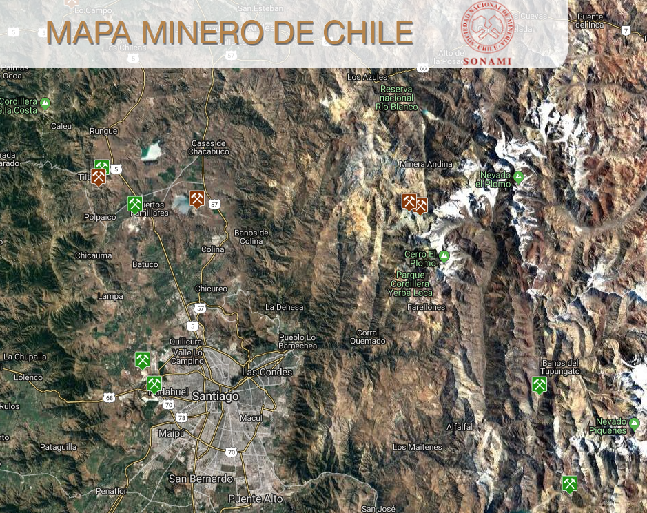 En el límite de las regiones Metropolitana y de Valparaíso se ubican las mineras Los Bronces (Anglo American) y Andina (Codelco) dedicadas a la extracción de cobre. Faenas cercanas a importantes glaciares como los campos Olivares, El Plomo, La Paloma, El Altar, entre otros.