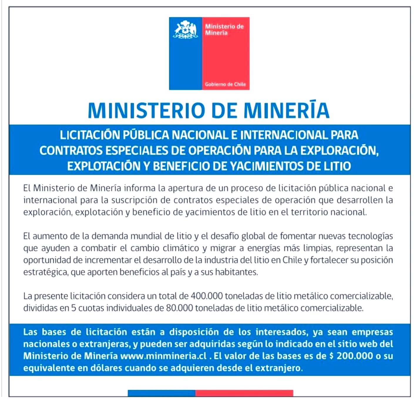 En la jornada del reciente miércoles 13 de octubre, desde el Ministerio de Minería comunicaron la decisión de realizar una convocatoria pública nacional e internacional para la suscripción de contratos especiales para quienes desarrollen la explotación y producción de yacimientos de litio en Chile.