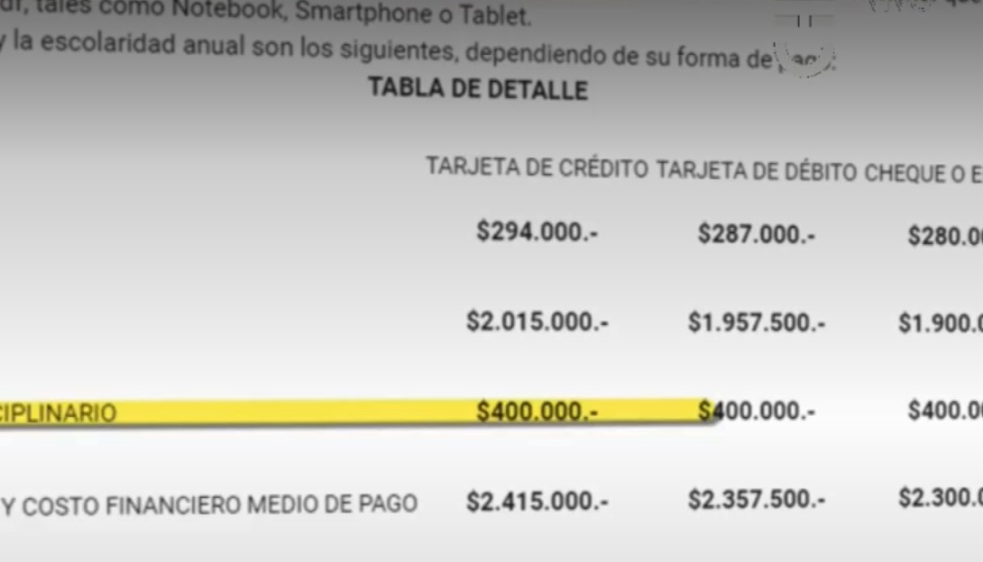 La madre de uno de los menores afectados, Mónica Martínez, detalló en Contigo en la Mañana de Chilevisión que recibió una carta "que venía con el arancel para el próximo para matricularlo, y me sale un recargo indisciplinario de 400 mil pesos".
