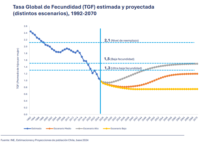 Actualmente la Tasa Global de Fecundidad (TGF), que estima el número de nacimientos vivos que tendría una mujer a lo largo de su vida fértil, proyecta que disminuya a 0,97 hijos por mujer, y que continúe a la baja hasta mediados de la próxima década.