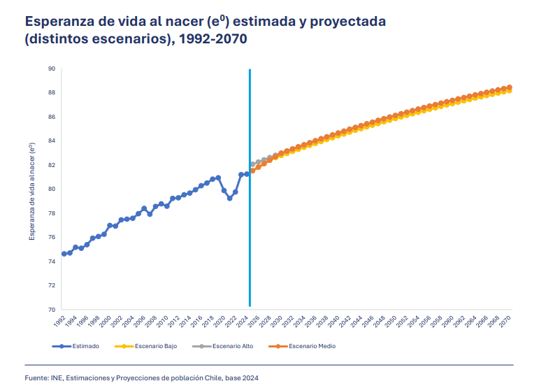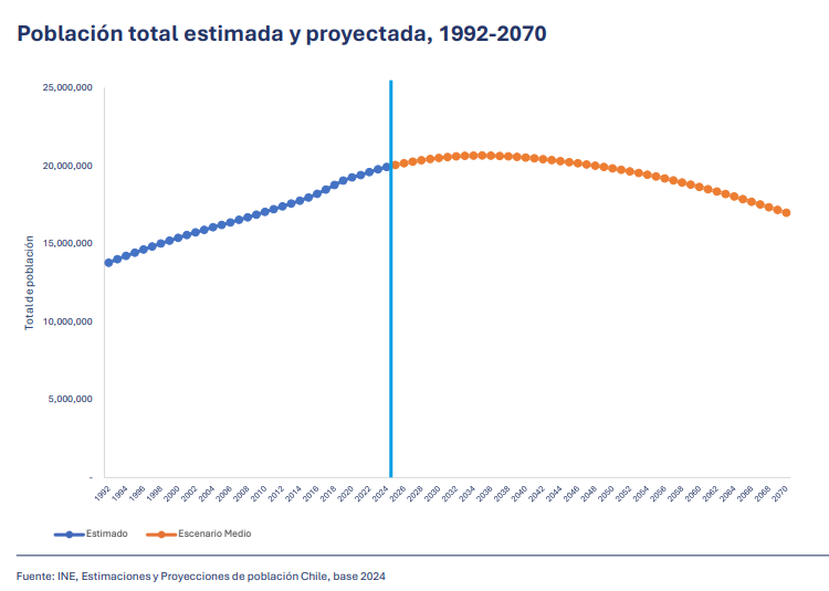 De este modo, el informe considera proyecciones hasta el 2070 de la composición de la población chilena, afectada principalmente por la baja en la tasa de natalidad.