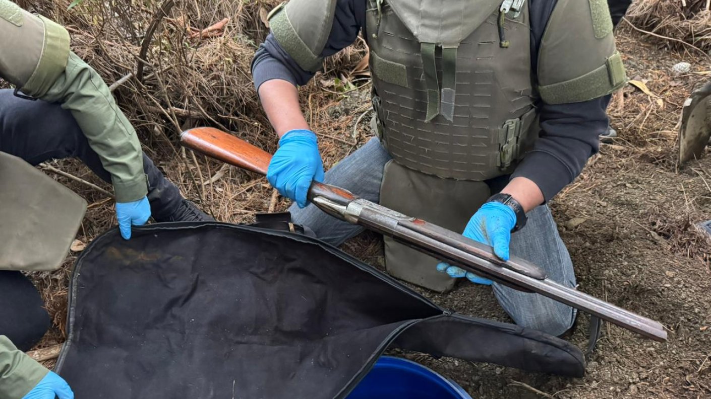 El tambor azul estaba enterrado en el lugar y contenía un arsenal que incluye armas y municiones. Dicho arsenal podría estar relacionado con el crimen de los mencionados funcionarios, aunque no se descarta su vinculación a otros hechos de violencia en la zona.