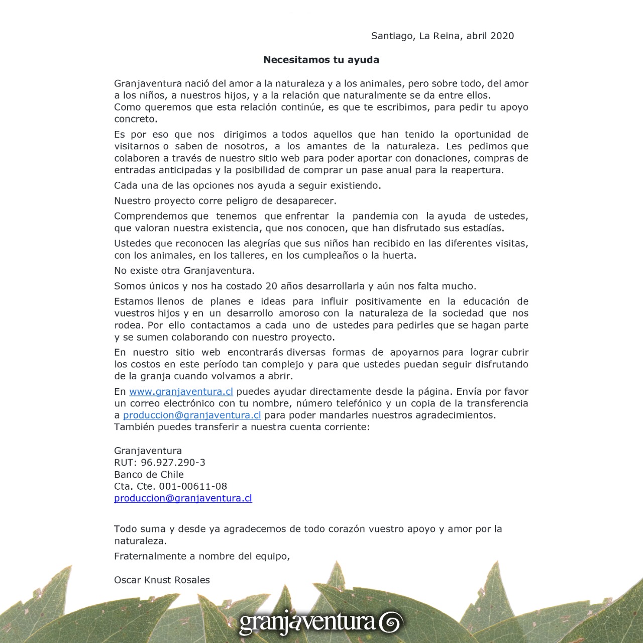 "El año pasado disminuyeron nuestras ventas en un 15% entre octubre y diciembre, llegamos a marzo con una caja muy disminuida, prácticamente sin reservas. Lo único que nos ha salvado es que en febrero habíamos comprado alfalfa, que es lo que comen nuestros animales, para tres meses, pero ese tiempo ya pasó y nos queda muy poco", comentó Oscar Knust, gerente general y fundador de la Granja aventura, a CHV Noticias.