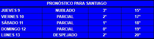 Este miércoles, la Dirección Meteorológica registró 1,3 milímetros de agua en Santiago (Quinta Normal). En Valparaíso, el Servicio Meteorológico de la Armada acumuló 18,4 milímetros  Mientras las lluvias se suceden sobre el sur, la zona central espera heladas en los valles para los próximos días. “El domingo tendremos la mañana más fría de la semana en la capital (0° de mínima), pero con máximas que rondarán 20 grados”, anticipa el meteorólogo, Eduardo Sáez.   Por el momento no se avizoran lluvias significativas en el corto plazo para las regiones de Valparaíso y Metropolitana.
