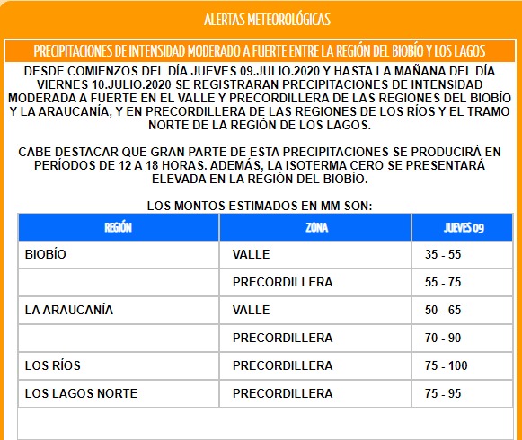 ¡Intenso temporal sobre el sur de Chile! La Dirección Meteorológica emitió una alerta, porque “se registrarán precipitaciones de intensidad moderada a fuerte en el valle y la precordillera de Biobío, La Araucanía, Los Ríos y el tramo norte de Los Lagos”. Esto se producirá “desde comienzos del jueves (9 de julio) hasta la mañana del viernes (10 de julio”, afirma el organismo oficial.  Según detalla la DMCcabe destacar que gran parte de estas precipitaciones se producirán en periodos de 12 a 18 horas. Además, la isoterma 0 se presentará elevada en la región de Biobío”.  Y, precisamente, esa es la combinación que preocupa: Lluvia e isoterma 0 para estar en julio. “En la zona, en promedio, nevará a partir de mil 800 a 2 mil metros de altitud. Eso es alto para una lluvia así de intensa en pleno invierno”, afirma el meteorólogo de CHV NoticiasCNN Chile, Eduardo Sáez.