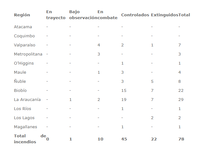 Desde la Onemi además entregaron una nueva actualización nacional de los incendios en el territorio chileno, donde se reportan 78 incendios forestales a nivel nacional, de los cuales 10 se encuentran activos, 45 controlados y 1 bajo observación. Cabe destacar que durante la presente jornada 22 incendios fueron extinguidos.
