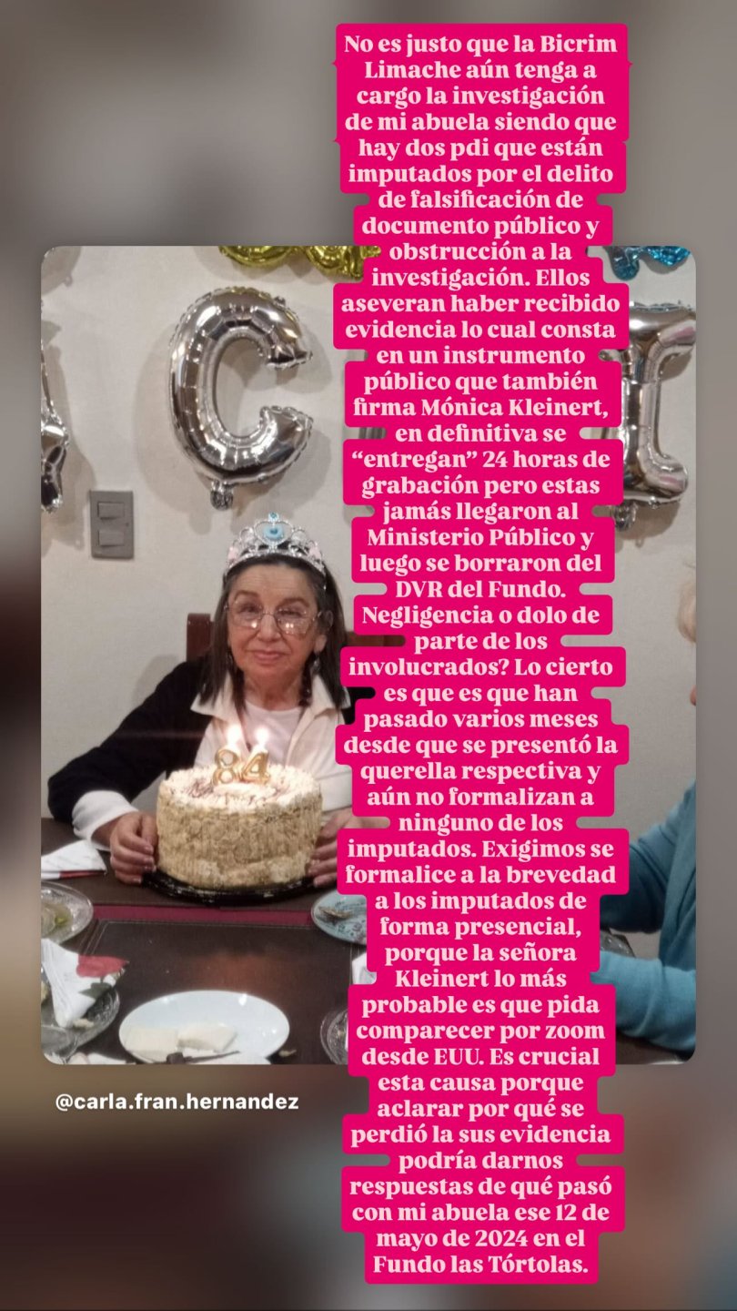 "No es justo que la Bicrim Limache aún tenga a cargo la investigación de mi abuela siendo que hay dos PDI que están imputados por el delito de falsificación de documento público y obstrucción a la investigación", partió señalando Hernández a través de una historia de Instagram.