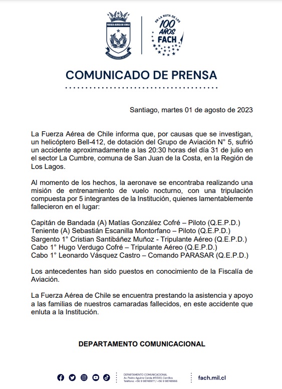 Desde la Fuerza Aérea de Chile (FaCh), indicaron mediante un comunicado que "por causas que se investigan, un helicóptero Bell-412, de dotación del Grupo de Aviación N° 5, sufrió un accidente aproximadamente a las 20:30 horas".