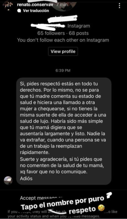 “Si pides respeto estás en todo tu derecho. Por lo mismo, no sé para qué tu madre comenta su estado de salud y hace un llamado a otra mujer a chequearse, si no tienen la misma suerte de ella de acceder a una salud de lujo”, partió diciendo el usuario.