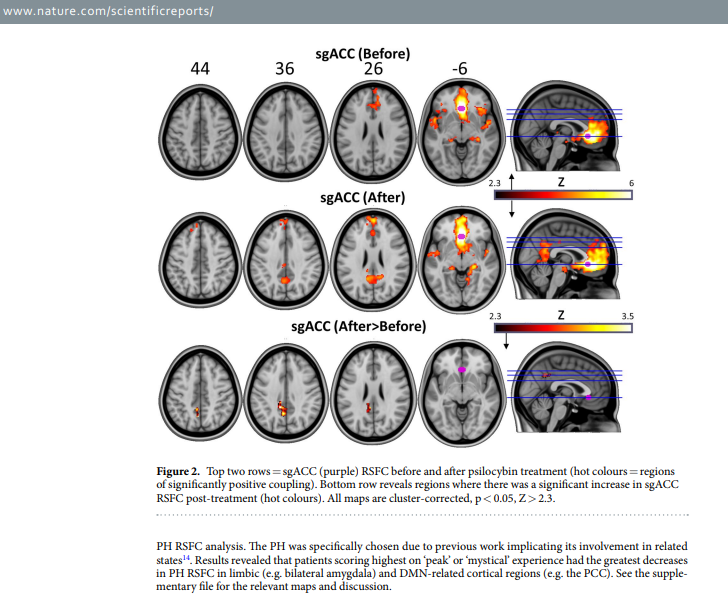 El estudio también demostró que el efecto de los hongos alucinógenos, o más específicamente, de la psilocibina en personas sanas, causa desregularización de la actividad generando desorden cerebral, en cambio, en quienes padecen depresión genera un efecto "reinicio" que les permitiría volver a la normalidad o al menos, atenúa la enfermedad.