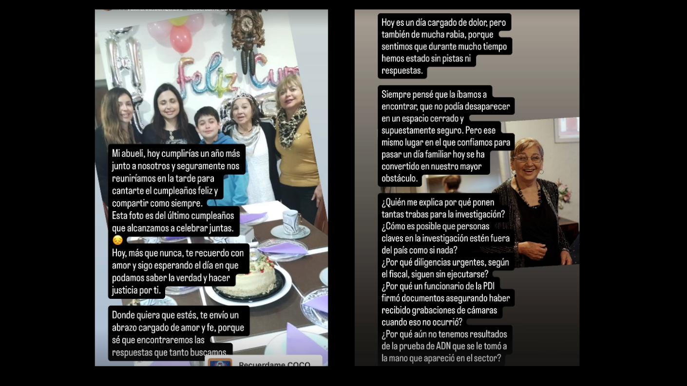A continuación puedes ver las dos historias que publicó Natalia Fernández, nieta de María Elcira Contreras, mujer de 87 años desaparecida desde el 12 de mayo de 2024.