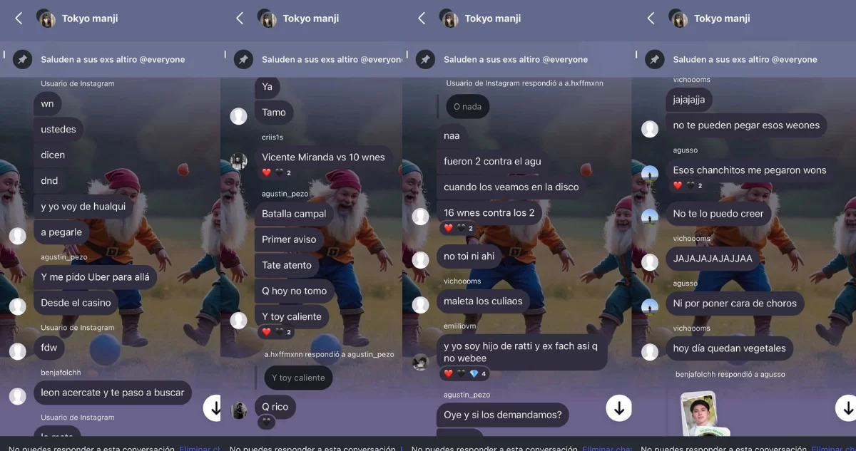 Luego, otro afirmó: "Cuando los veamos en la disco. 16 hue... contra los 2. No estoy ni ahí". Ante esto, un tercero comentó: "yo soy hijo de ratti y ex fach así que no we...".