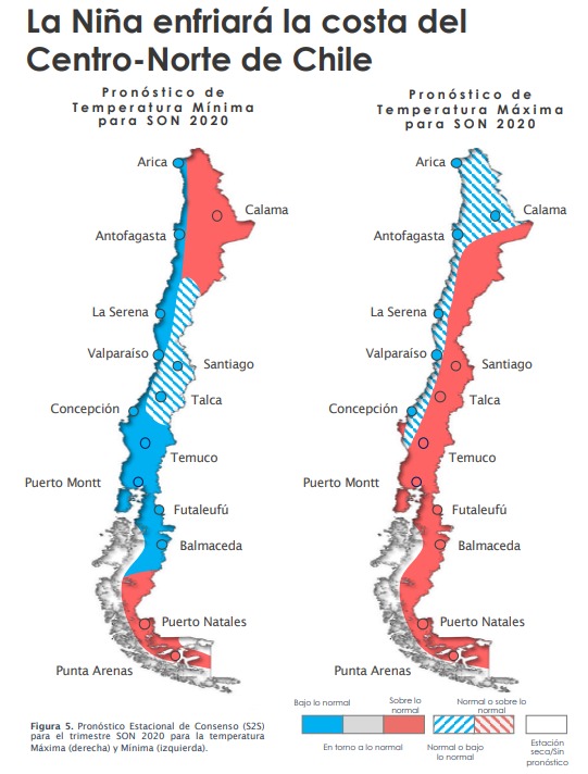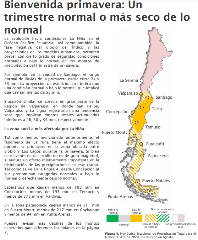 De acuerdo con el análisis de los especialistas, existe un 60% de probabilidades que se oficialice la llegada del fenómeno La Niña durante esta primavera, lo cual influiría en mantener la sequía este año sobre el centro-sur del país, y además, aumentaría la opción de heladas durante septiembre en los valles centrales.