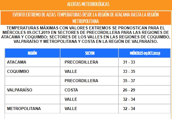 La Dirección Meteorológica de Chile emitió una nueva alerta de calor para este miércoles (9 de octubre) con temperaturas que podrían alcanzar 37 grados en sectores al interior entre las regiones de Atacama y Metropolitana.