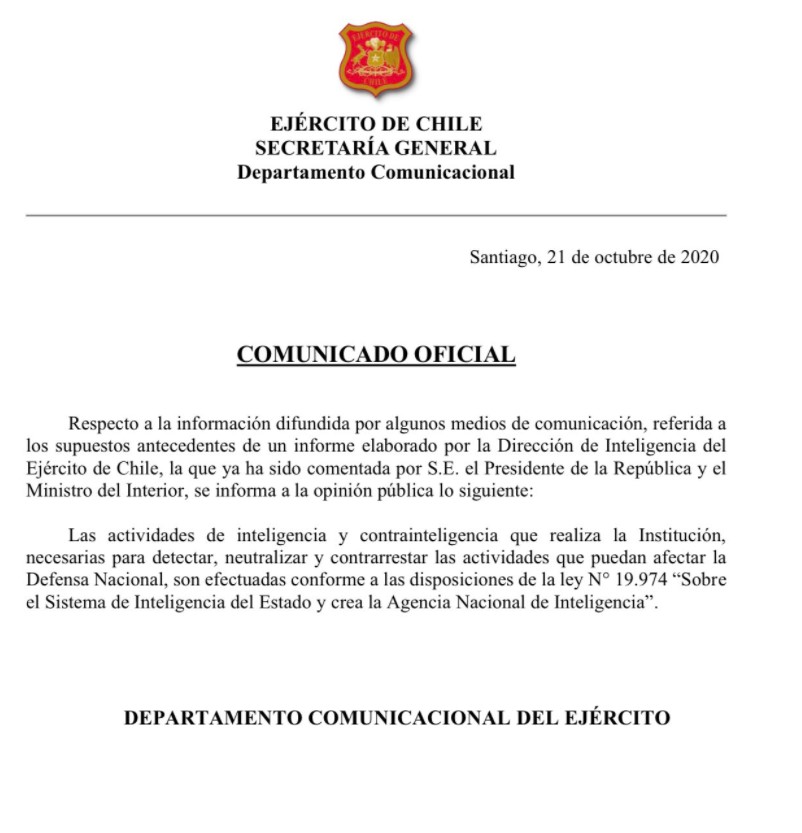 "Las actividades de inteligencia y contrainteligencia que realiza la institución, necesarias para detectar, neutralizar y contrarrestar las actividades que puedan afectar la Defensa Nacional, son efectuadas conforme a las disposiciones de la ley N°19.974 'Sobre el Sistema de Inteligencia del Estado y crea la Agencia Nacional de Inteligencia'", fueron las únicas palabras de parte del departamento de comunicaciones del Ejército.