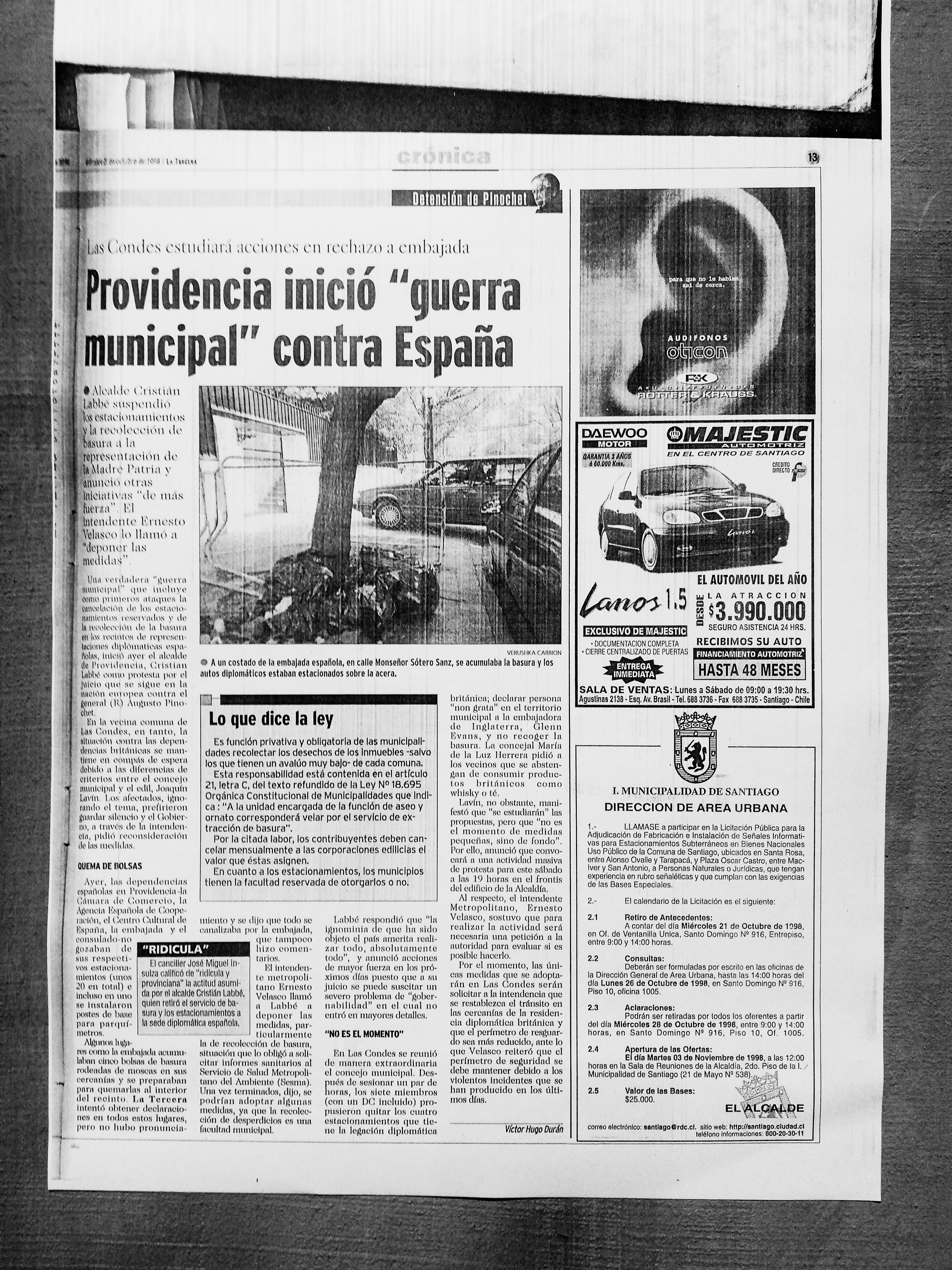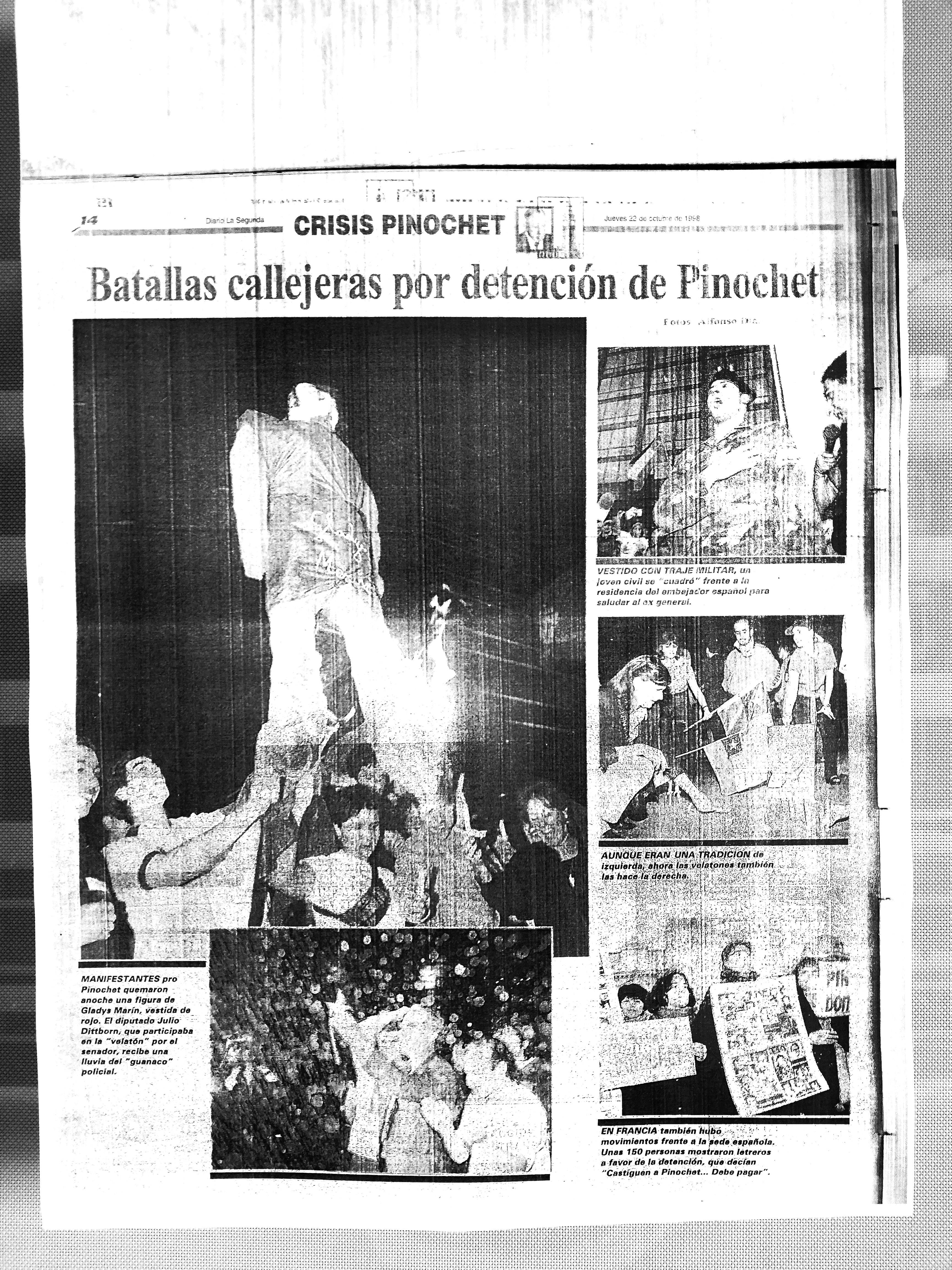 "Batallas callejeras por detención de Pinochet", tituló la edición del jueves 22 de octubre de 1998 de La Segunda para dar cuenta de las distintas manifestaciones por la detención del ex comandante en Jefe del Ejército.