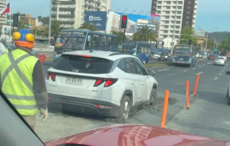 Un insólito hecho ocurrió este viernes en Concepción, cuando un conductor quedó atascado en una calzada con cemento fresco luego de ingresar con su vehículo, aún cuando había señales de alerta.