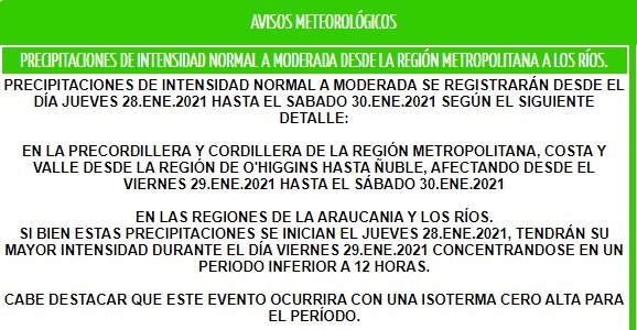 Las lluvias abundantes, incluso acompañadas por tormentas eléctricas, marcan estos últimos días de enero sobre el centro-sur del país, especialmente, entre O’Higgins y Los Ríos, aunque también estarán presentes en las regiones de Coquimbo, Valparaíso y Metropolitana.