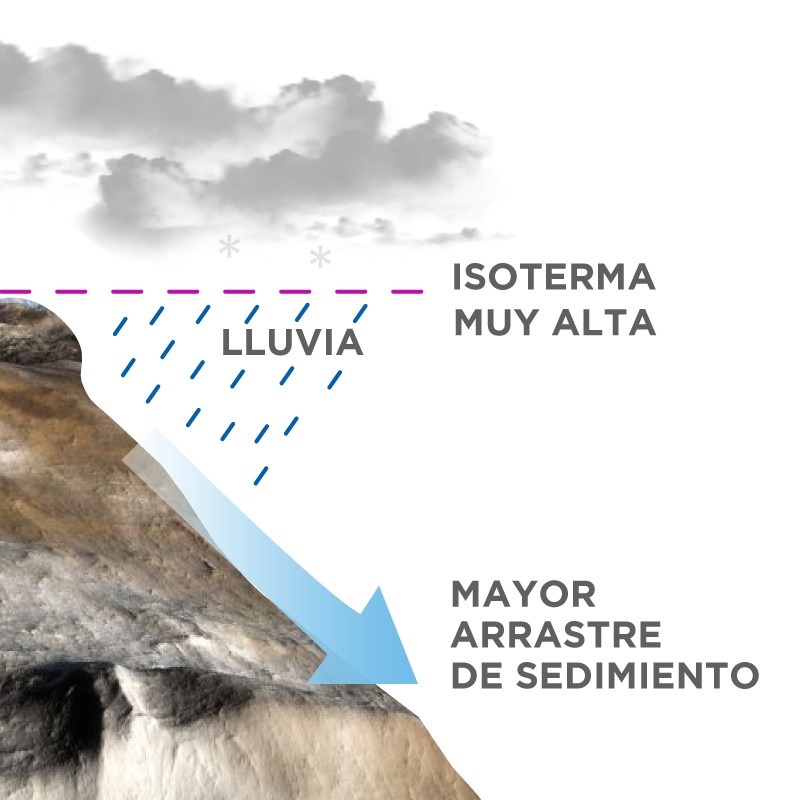 “En la cordillera hay mucho material suelto (piedras, rocas, arenas) que están habituados a recibir precipitación sólida (nieve) y no líquida (lluvia). Si cae mucha agua, parte de ese material escurre por las laderas de la montaña, ya sea en el cauce de los ríos, o en las quebradas, provocando deslizamientos de tierra o aluviones. Esto genera una reacción en cadena con la crecida repentina del cauce y el enturbiamiento de las aguas que pueden afectar el suministro en las plantas procesadores de agua potable”, anticipa Rodrigo Mondaca, geógrafo e integrante de la Red Meteorológica Aficionada de Chile (Redmeteo).