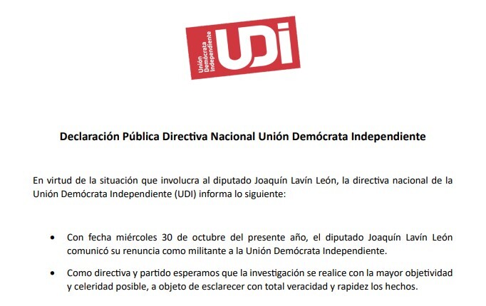 Joaquín Lavín León presentó su renuncia a la UDI luego de que se diera a conocer la investigación en su contra por presuntas facturas falsas, presentadas por la Municipalidad de Maipú cuando su esposa, Cathy Barriga, ejercía como alcaldesa.