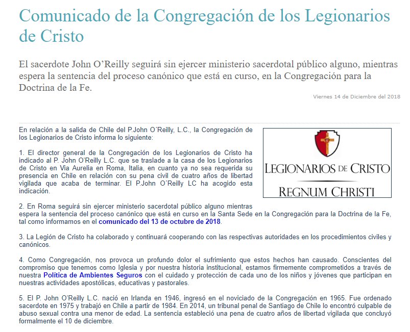 O’Reilly -que trabajó en Chile a partir de 1984- fue enjuiciado en 2014 por dos acusaciones de abuso sexual contra estudiantes del colegio Cumbres, siendo condenado por una de ellas a cuatro años de libertad vigilada. El sacerdote, además, fue relegado de su nacionalidad por gracia la que obtuvo en 2008.