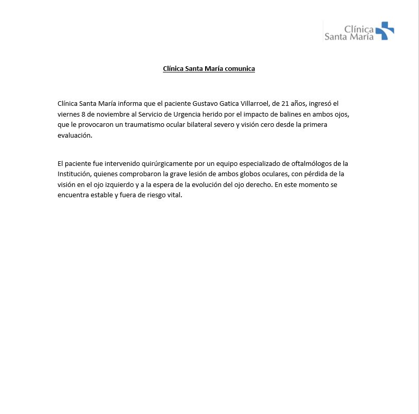 Esta noche, la Clínica Santa María informó que el paciente Gustavo Gatica Villarroel, quien fue herido por el impacto de balines en ambos ojos resultó con pérdida de la visión en el ojo izquierdo y a la espera de la evolución del ojo derecho.