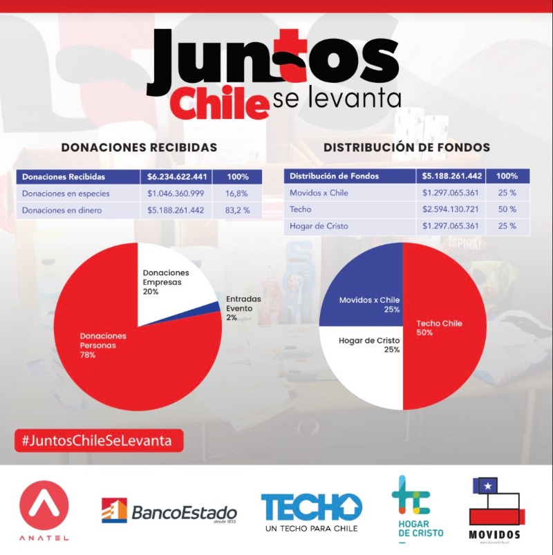 Las organizaciones Hogar de Cristo, Movidos x Chile (un programa de la Comunidad de Organizaciones Solidarias) y TECHO-Chile levantaron la iniciativa y, con apoyo de Banco Estado, Anatel y otros organismos, lograron recaudar $6.238.523.949 a través de un multitudinario evento solidario.