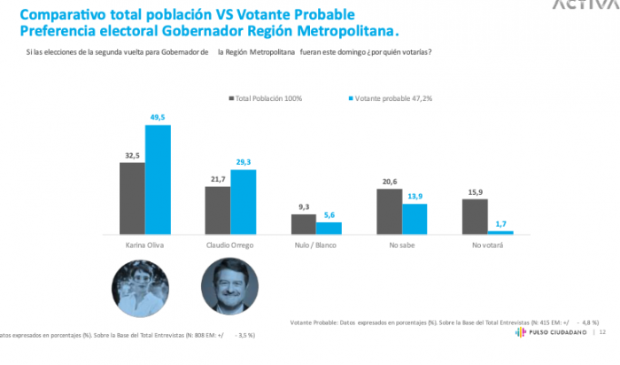 En el caso de la Región Metropolitana, el sondeo concluyó un eventual triunfo de Karina Oliva (Comunes) con un 32,5% del total de la población. Mientras que Claudio Orrego (DC), candidato respaldado por Unidad Constituyente, obtendría un 21,7% de apoyo.