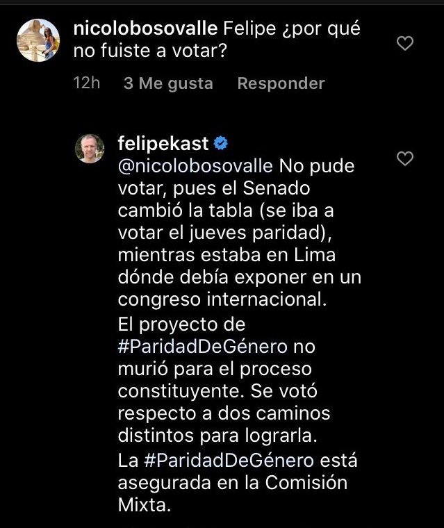 "Hoy en el Senado NO murió la #ParidadDeGénero para el proceso constituyente. Se votó respecto a dos caminos distintos para lograrla. La #ParidadDeGénero está asegurada en la Comisión Mixta", agregó.