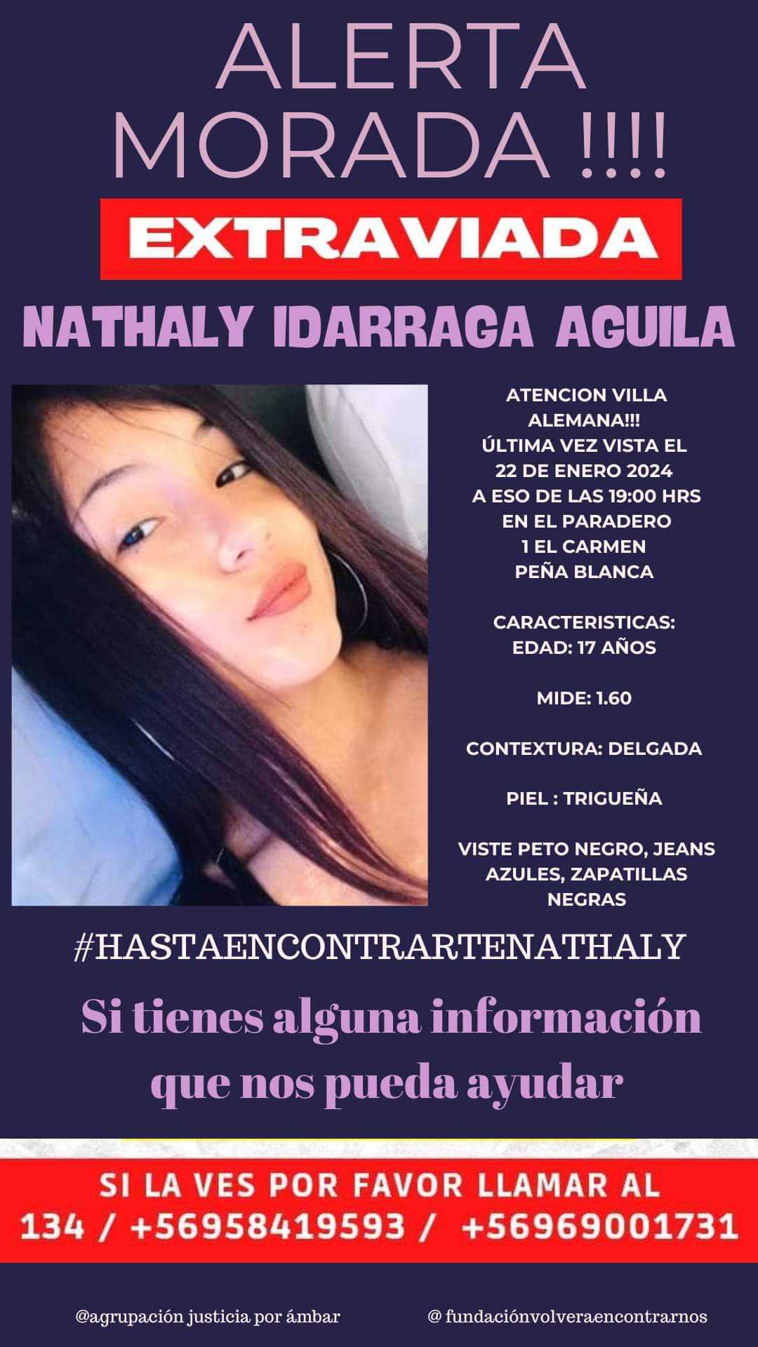 En redes sociales se activó la "alerta morada", para ayudar a la familia en la búsqueda de Nathaly Idarraga Aguila, quien está desaparecida desde el pasado lunes 22 de enero. "Lo último que supimos fue a través de una excompañera de curso, que dijo que el lunes apareció por allá, en Limache", comentó su madre.