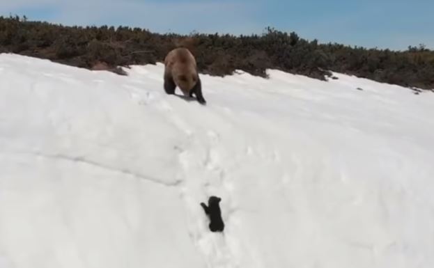 Un dron captó al osezno tratando de escalar una cima nevada, acción que fue difundida como un momento de superación.