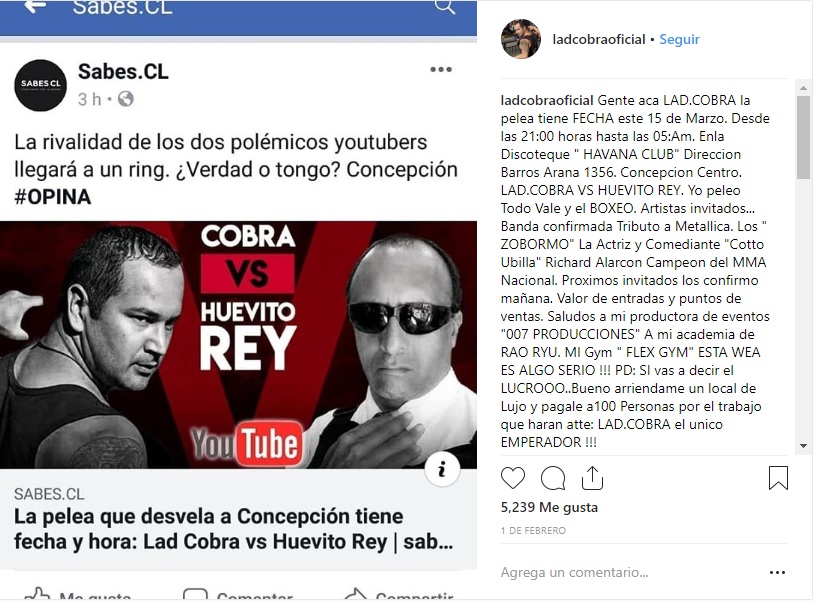 Hace poco más de una semana se realizó la denominada “Pelea del Siglo” entre los youtubers Huevito Rey y Lad Cobra. El anuncio causó gran expectación en la Havana Club, una disco en la ciudad de Concepción al que llegaron cientos de seguidores de estos polémicos personajes -algunos pagaron hasta $15 mil por ver el show-.