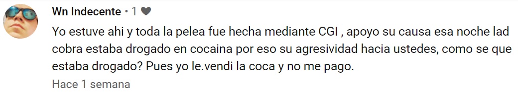 La promoción en redes sociales prometía un combate estilo “Todo Vale” en un ring de boxeo, con Junior PlayBoy como anfitrión. Nada de esto sucedió, salvo lo del presentador. Solo hubo un escenario improvisado y un combate de apenas unos segundos, donde Lad Cobra atacó a un Huevito Rey que poco y nada hizo para defenderse.