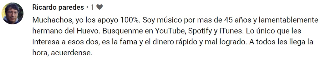 En la misma línea de comentarios, también se hace mención de Huevito Rey -cuyo nombre es Mauricio Paredes Bugueño- y fue nada menos que su hermano Ricardo Paredes, quien apoyó la acusación de los músicos y comentó que a ambos youtubers lo único que les interesa es la fama y el dinero rápido, mal logrado.