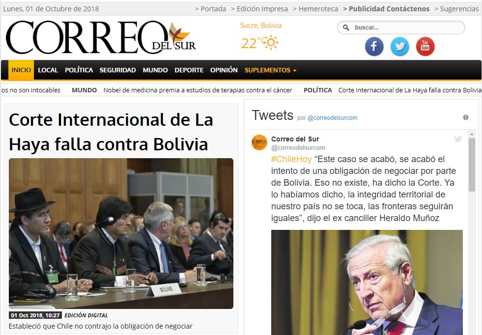 Te puede interesar: “Un mar de lágrimas”: Los memes que dejó el fallo de La Haya por la demanda marítima de BoliviaLa sentencia tuvo una rápida reacción en Bolivia, y los medios dedicaron sus portadas a la aplastante resolución de la corte.