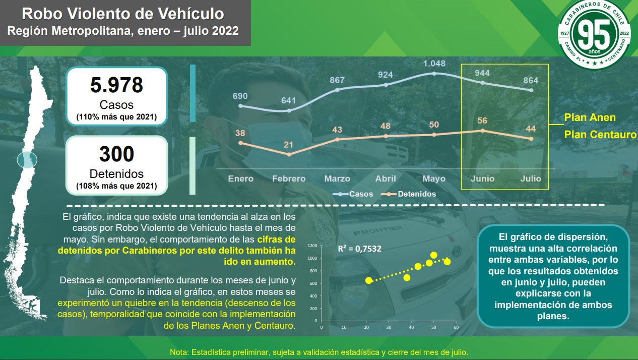 Según un balance realizado por Carabineros, hasta la fecha se han registrado 5.978 casos asociados al robo de autos, es decir, un 110% más que en 2021. Sin embargo, ya hay 300 detenidos por estos sucesos, lo que se traduce en un 108% más que el año pasado en el mismo periodo.