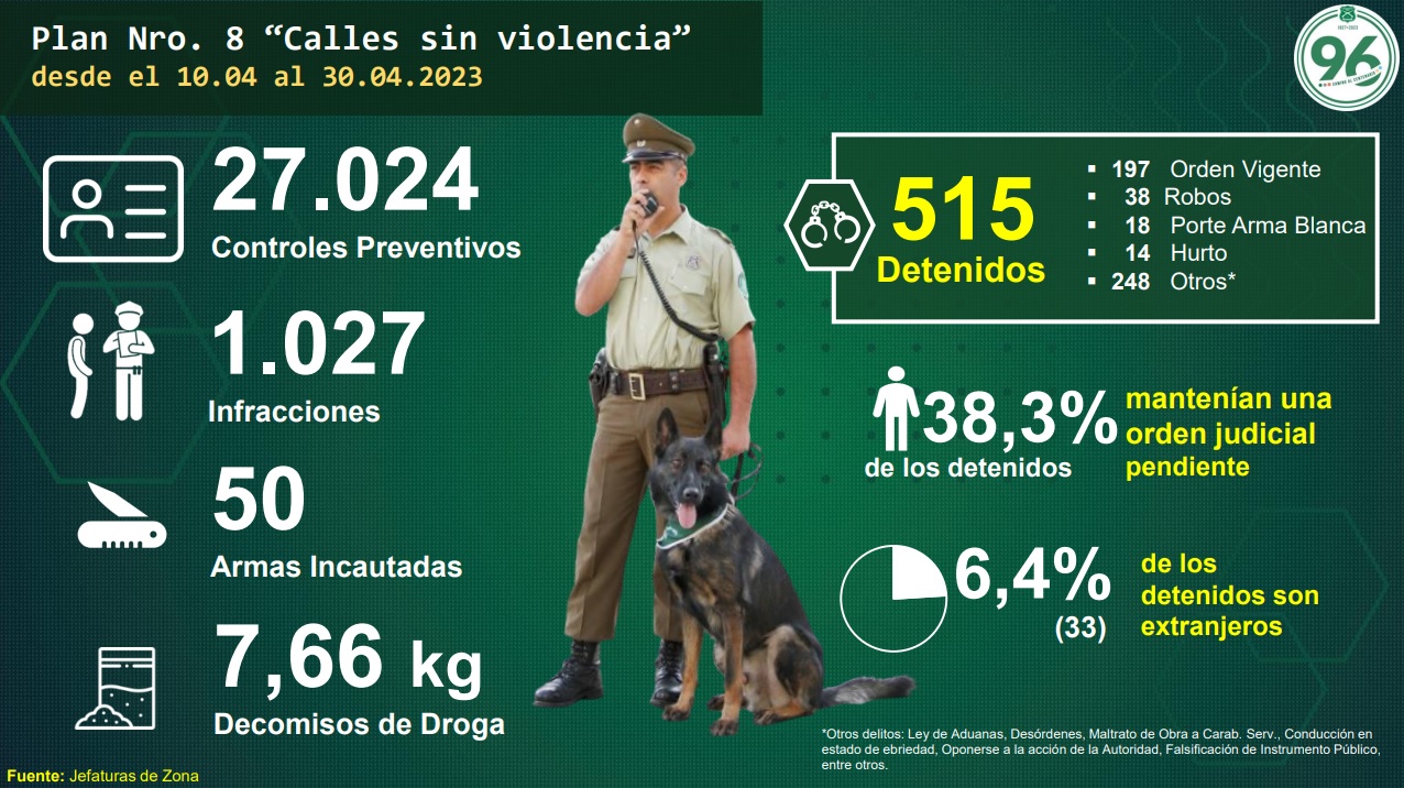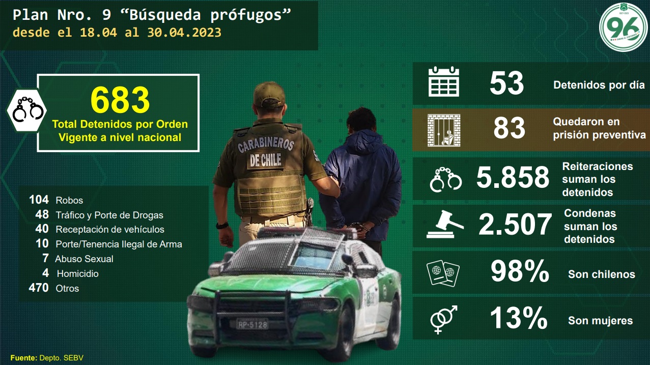 Como parte del programa, también se encuentra el plan Búsqueda de Prófugos, el cual logró la detención de 638 personas (82% chilenos) con órdenes vigentes de detención, en una fecha que abarcó desde el 18 de abril hasta el último día del mes.